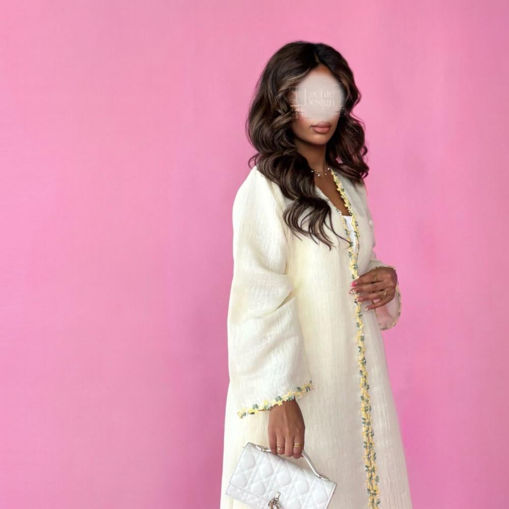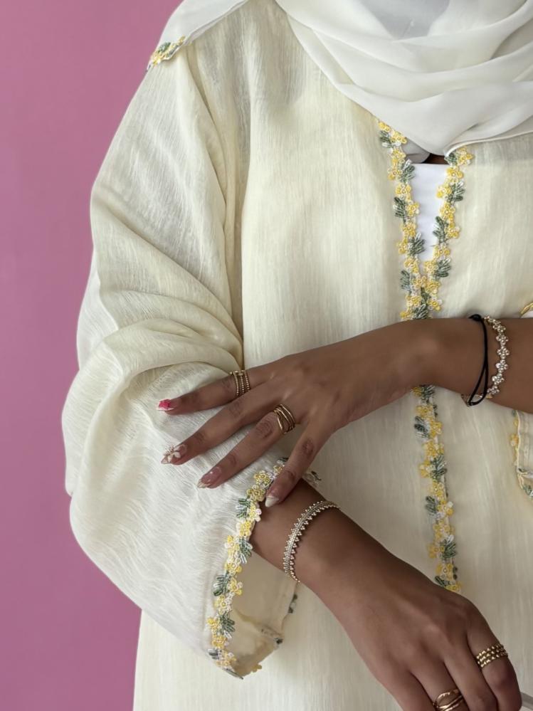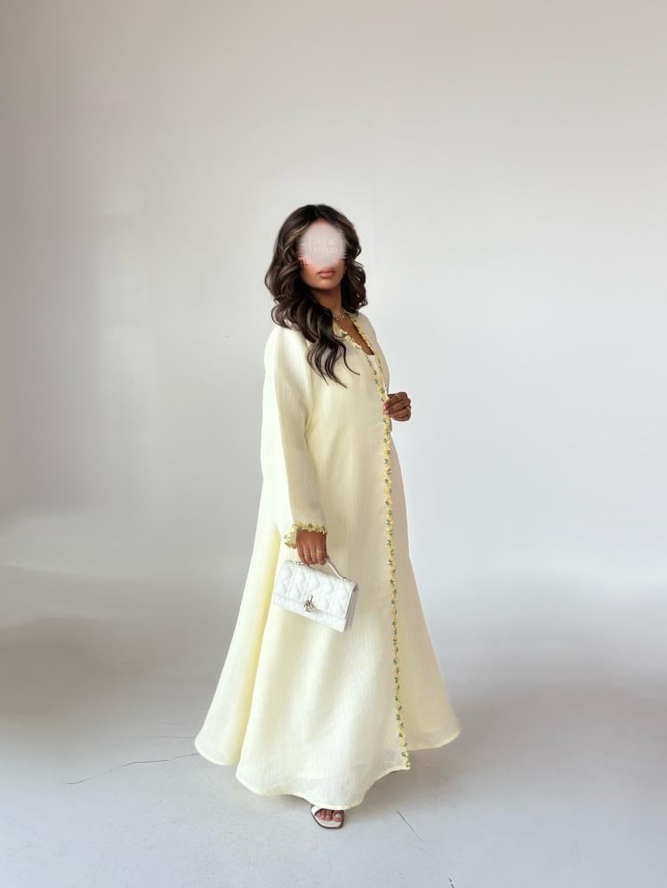 الاقمشه : اورقنزا ناعم مبطن بشيفون معل كلفه ورد اصفر واخضر بالاطراف